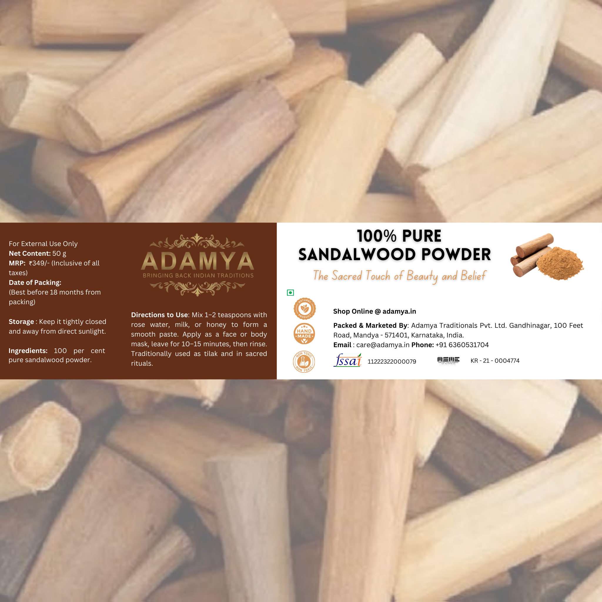 Adamya's Pure Sandalwood Powder (Chandan) - 100% Natural & Authentic - For Face Packs, Skin Care & Ritual Use - 50g