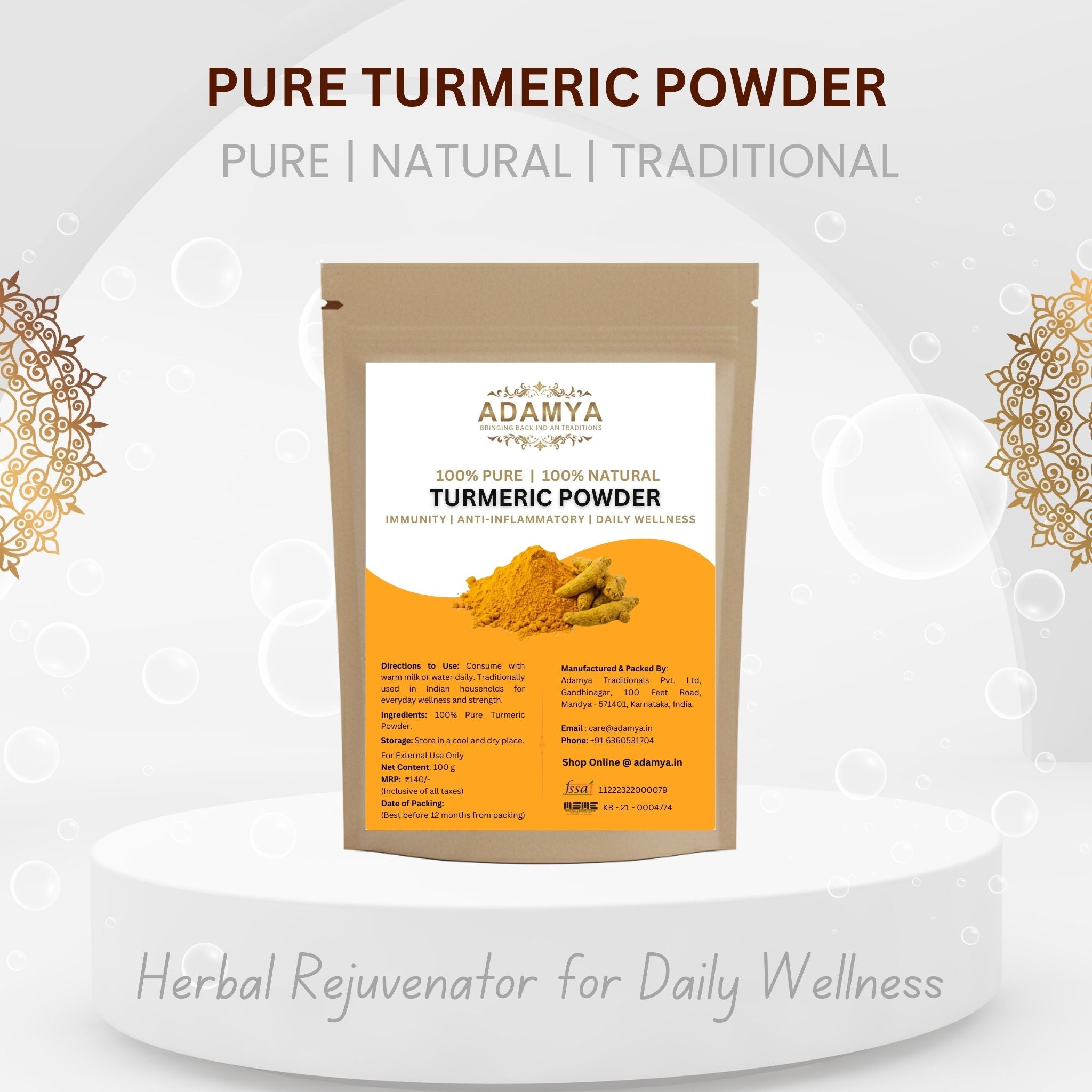 DESCRIPTION Pure turmeric powder is used from our ancient traditional method as a spice, medicine from the centuries to treat wounds, infections, cold and liver disease. It is rich in flavour and sourced from the rhizomes of the turmeric plant, This bright yellow powder is packed with antioxidants and the active compound...